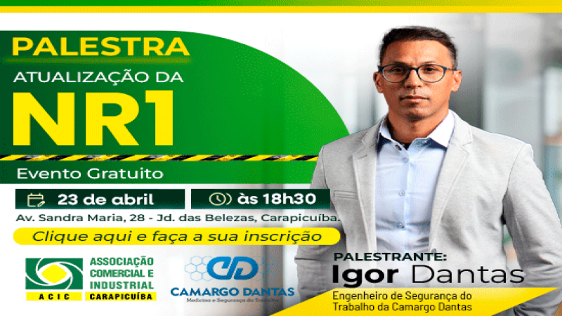 A ACIC Carapicuíba convida você para a palestra: Atualização da NR1 Um encontro especial com Igor Dantas, Engenheiro de Segurança do Trab...